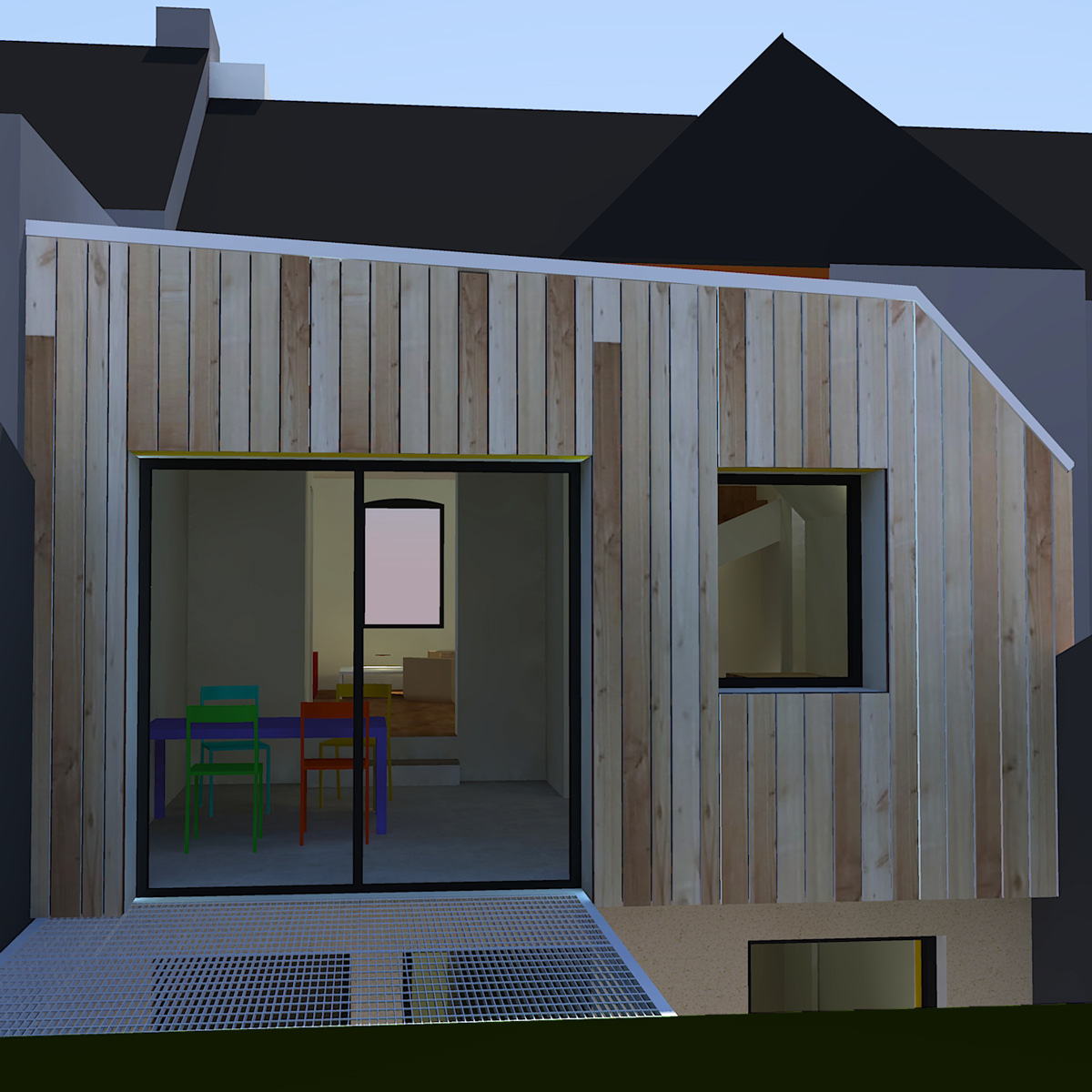projet d'extension sur un Rez de JardinOssature boistoiture Zincbardage melèze naturel