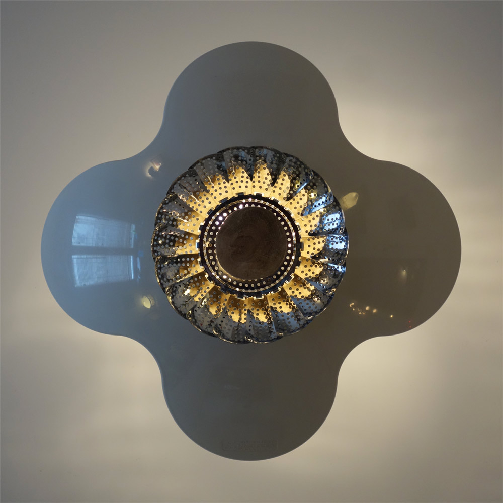 lampe en suspension.éléments détournés: ustensile de musculation, patisse cuit vapeur, bol inox.chêne brut taillé, aluminium, acier.