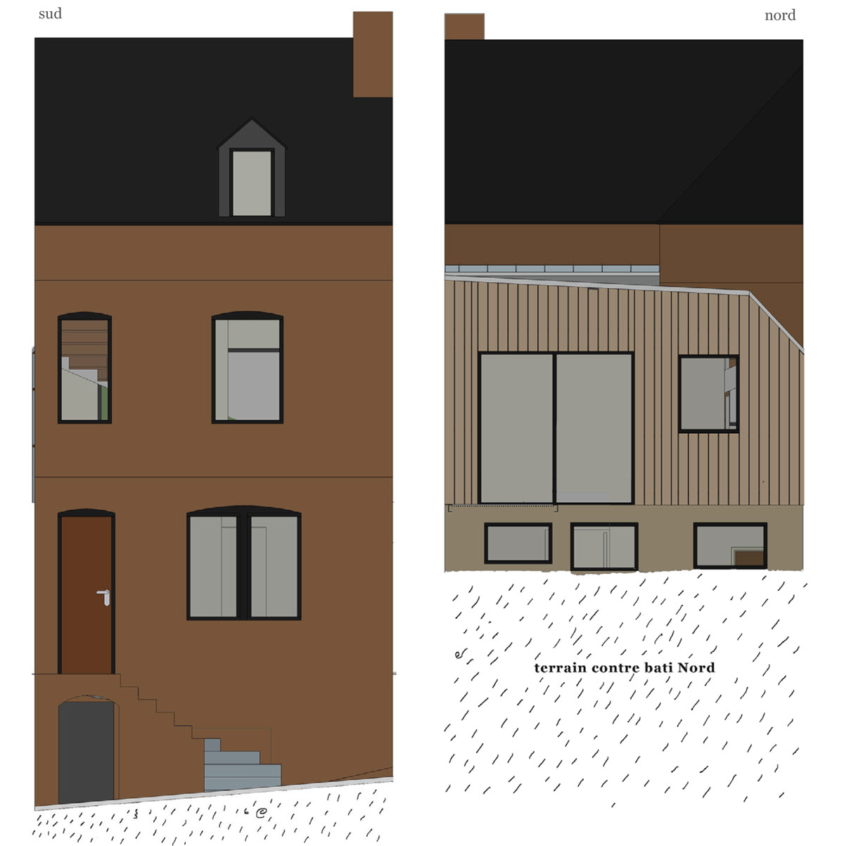 C'est pourquoi il nous est venu l'idée de faire monter le salon et la cuisine au rez de jardin (niveau 1), et de mettre 2 chambres et une salle de bains au RdC (niveau 0).