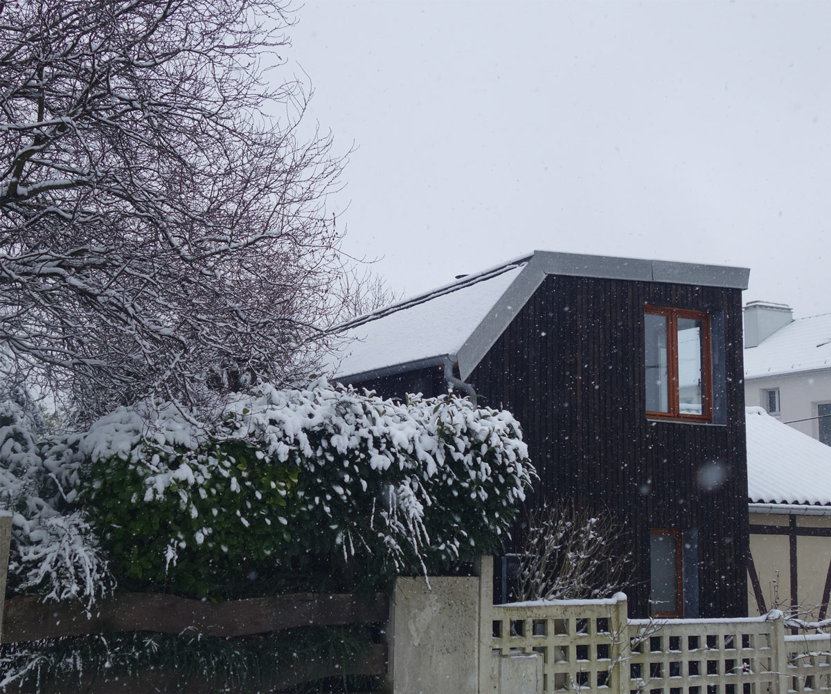 Une contrainte liée au PLU consistait à limiter la hauteur de gouttière à 3m50 en limite de terrain à l'arrière de l'extension.